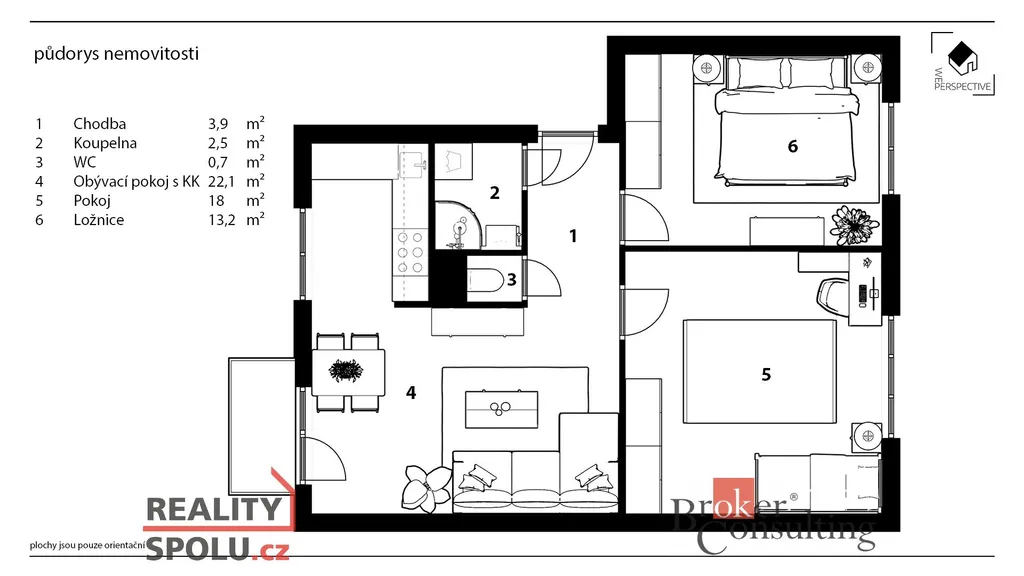 Dispozice bytu: vstupní chodba, koupelna, WC, ložnice, pokoj, obývací pokoj s kuchyňským koutem a balkónem. Součástí pronájmu je také sklep.