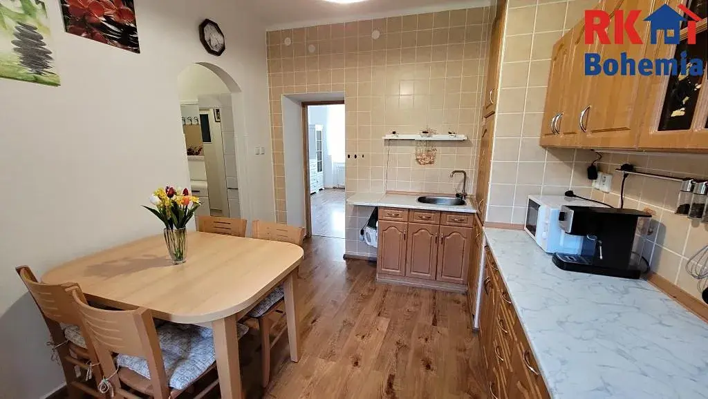 Dispozice: předsíň, koupelna se sprchovým koutem + WC, ložnice, prostorný obývací pokoj, kuchyně, spíž, k bytu náleží dva sklepy.