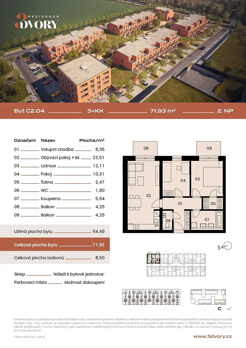 Nabízíme k prodeji byt typu 3+kk o výměře 71,93 m2, která zahrnuje podlahovou plochu bytu 63,43 m2 a balkonovou plochu o velikosti 8,5 m2. Byty se nacházejí v rezidenčním komplexu Tři Dvory, na okraji malebného města Újezd u Brna, vzdáleného pouze 15 km od centra Brna.