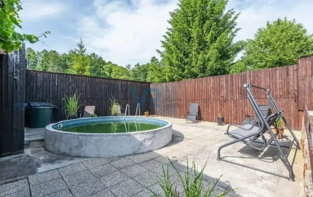 Dále zahrada nabídne částečně zapuštěný bazén, kolem kterého je dlažba.