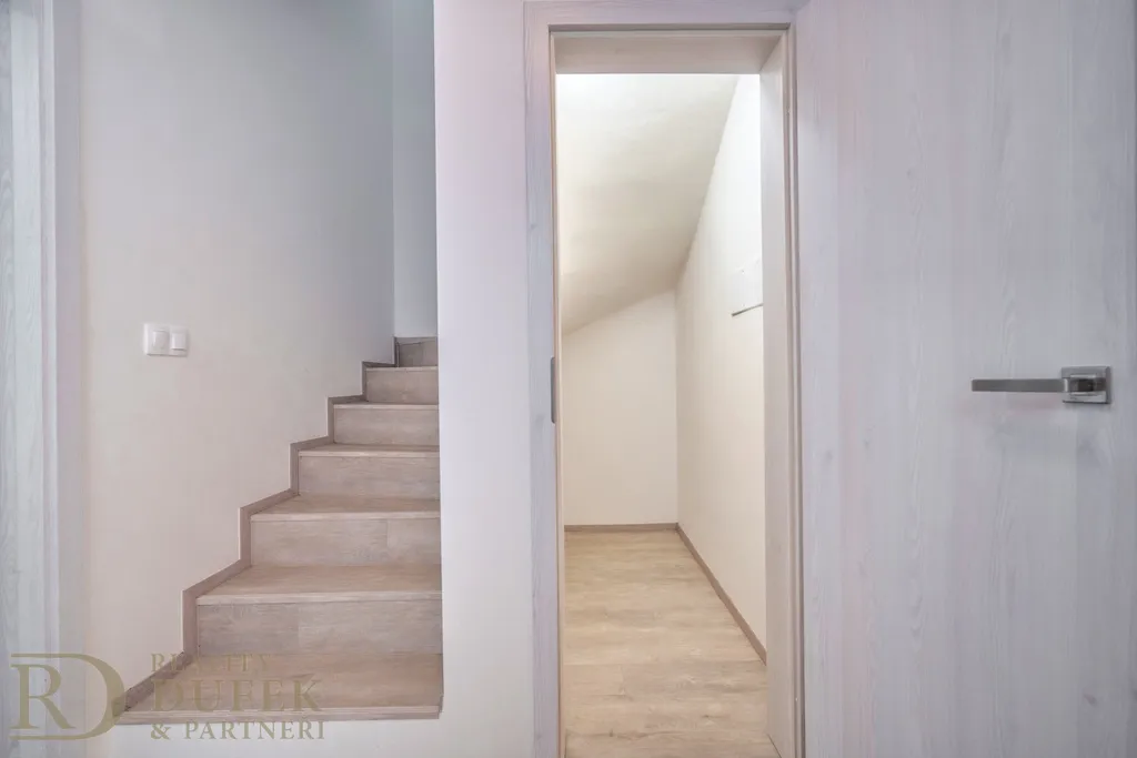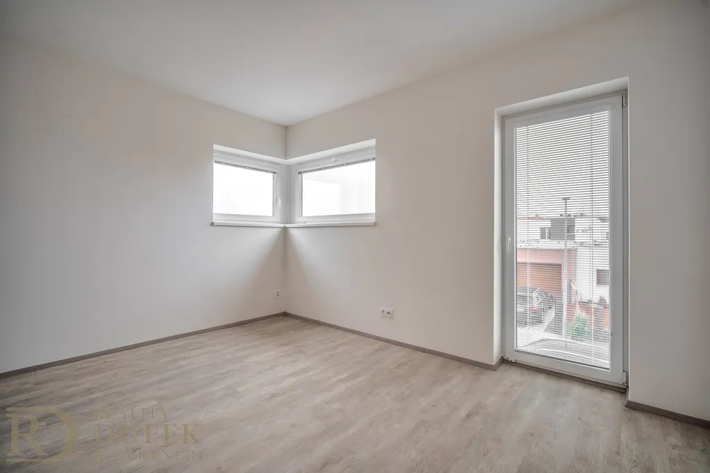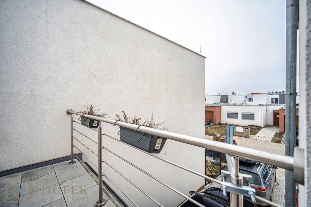 Součástí domu jsou dvě terasy, z nichž jedna plynule navazuje na menší zahradu s příjemným výhledem do zeleně, která nabízí klidné místo pro relaxaci, posezení nebo rodinné aktivity. K nemovitosti náleží také dvě venkovní parkovací stání.