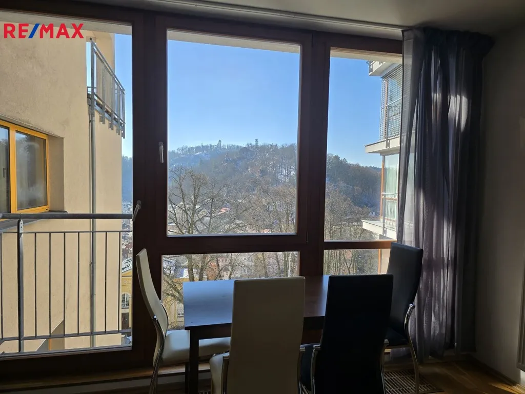 Dominantou bytu je prostorný obývací pokoj s kuchyňským koutem a výhledem na Karlovy Vary, který interiéru dodává světlo, otevřenost a příjemnou atmosféru.