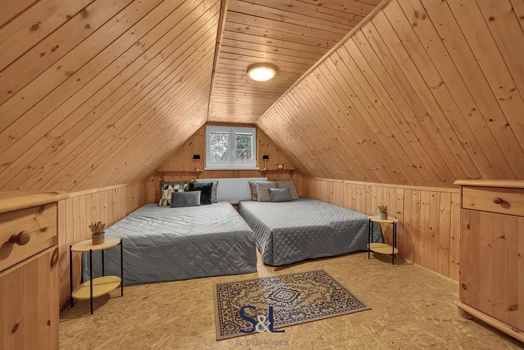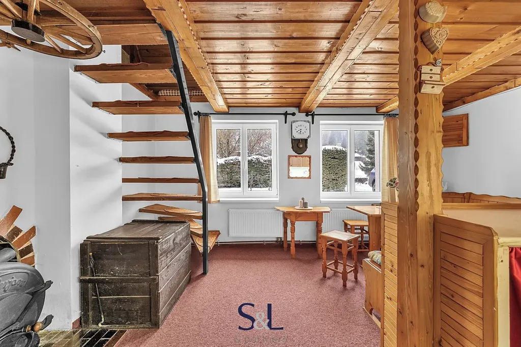 Interiér si zachoval autentický horský charakter – obývací pokoj s roubenými prvky a kamny na dřevo, kuchyni s jídelním koutem, koupelnu s vanou a WC a dvě podkrovní ložnice v patře.