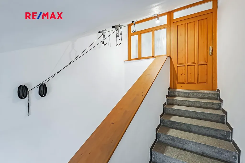 Součástí je sklepní kóje přímo u bytu spolu s šikovně zabudovaným systémem pro uskladnění kol, aby bylo možné využít každý metr na maximum.