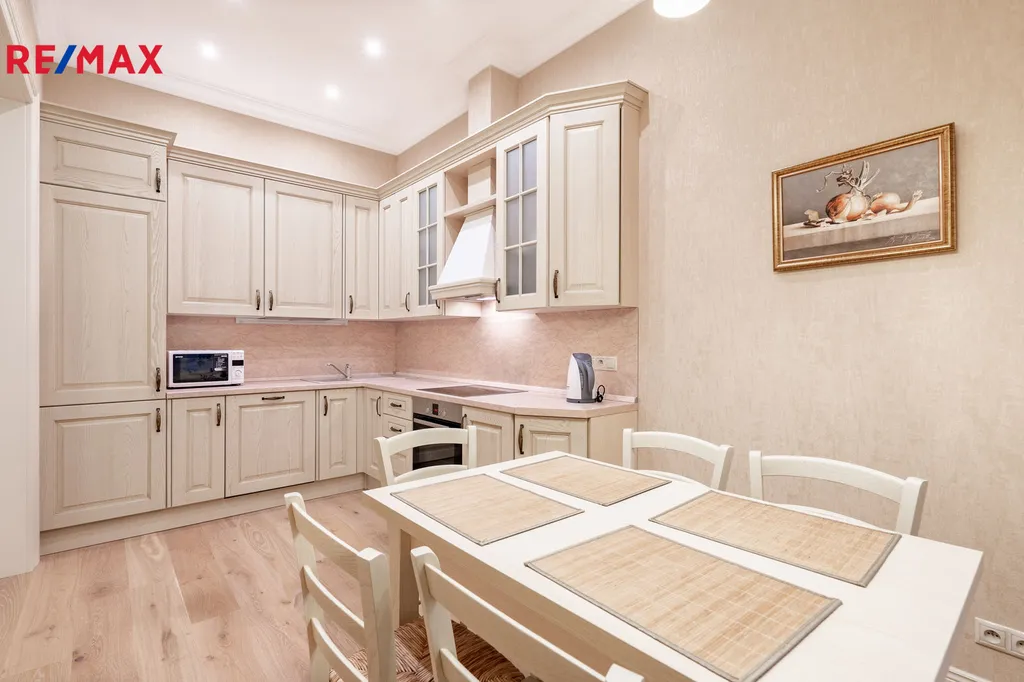 Byt prošel v roce 2016 náročnou a kompletní rekonstrukcí včetně výměny veškerých rozvodů a povrchů. Byly použity pouze kvalitní materiály – mramorová dlažba, dubový laminát, designové tapety a nadstandardní zařizovací předměty. Interiér je navržen v elegantním a nadčasovém stylu.