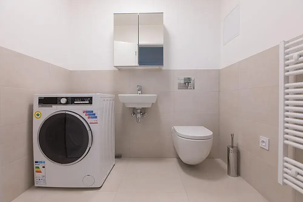 do okolí. V bytě je kromě koupelny i samostatná toaleta, kde je umístěná