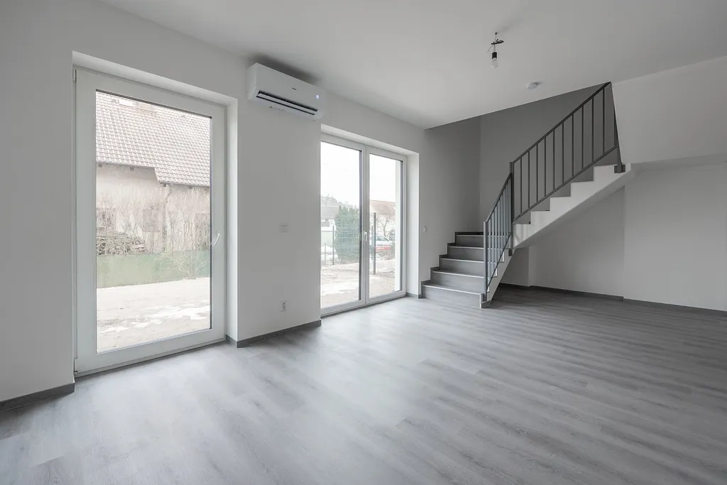 s předzahrádkami a parkovacím stáním. Byt o dispozici 3+kk a celkové podlahové ploše 90,1 m² + předzahrádka je vhodný jak pro rodiny s dětmi, tak pro páry hledající více prostoru. Díky rozdělení do dvou podlaží byt působí velmi vzdušně, přehledně a zároveň umožňuje přirozené oddělení společné a klidové části.