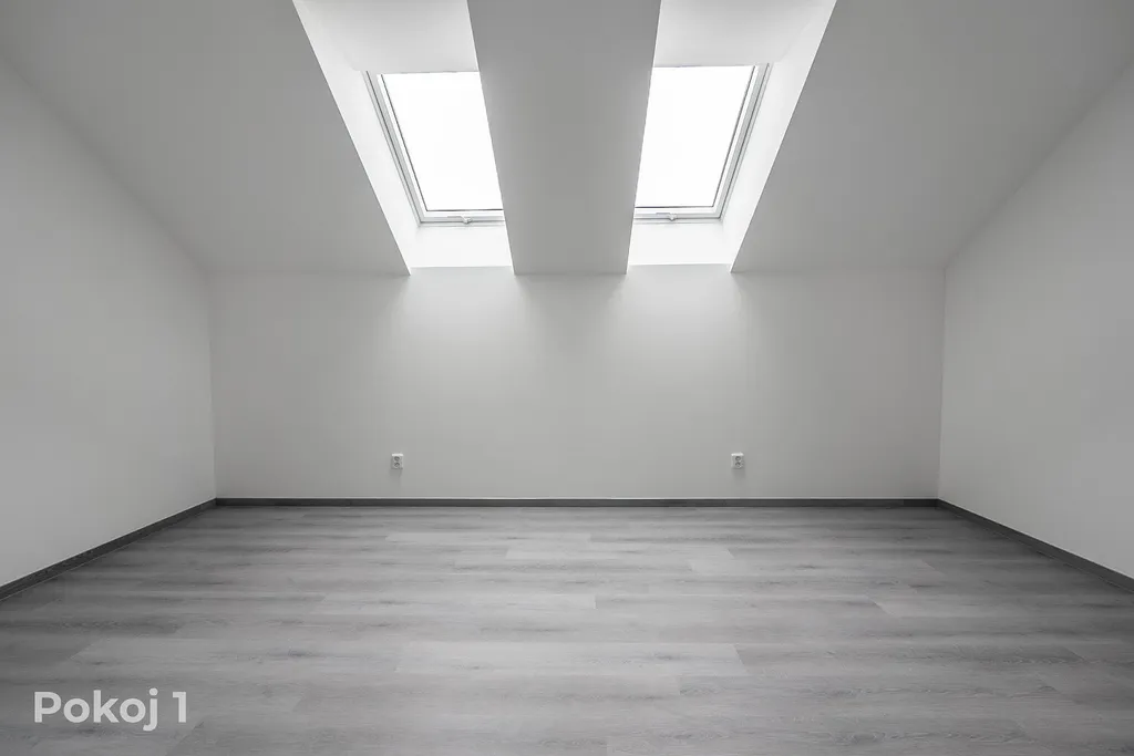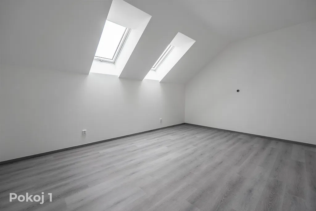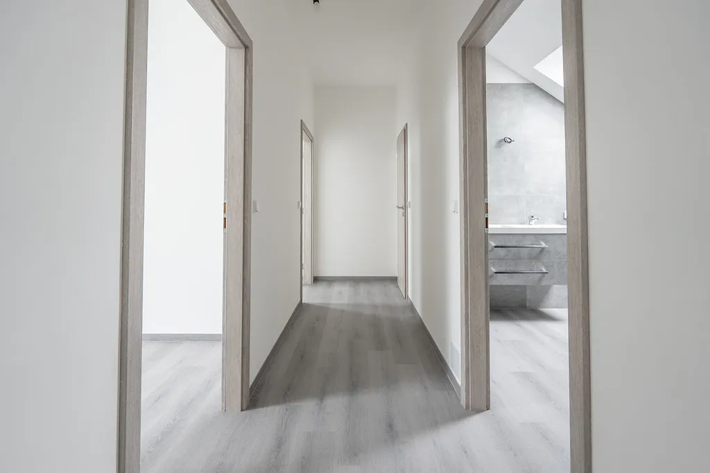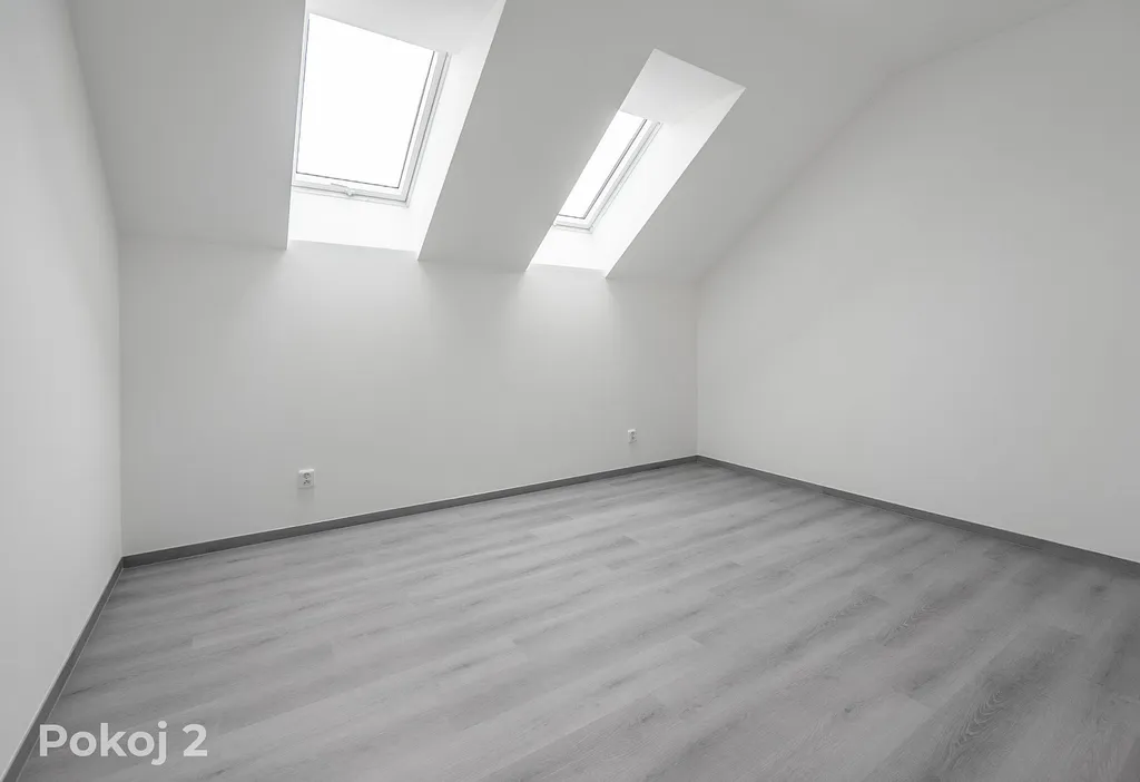 Druhé nadzemní podlaží (54,93 m²) je vyhrazeno klidové zóně bytu. Nachází se zde ložnice, dětský pokoj, koupelna s WC, chodba a druhá šatna, která poskytuje dostatek úložného prostoru. Tato část bytu nabízí soukromí a klid ideální pro odpočinek.