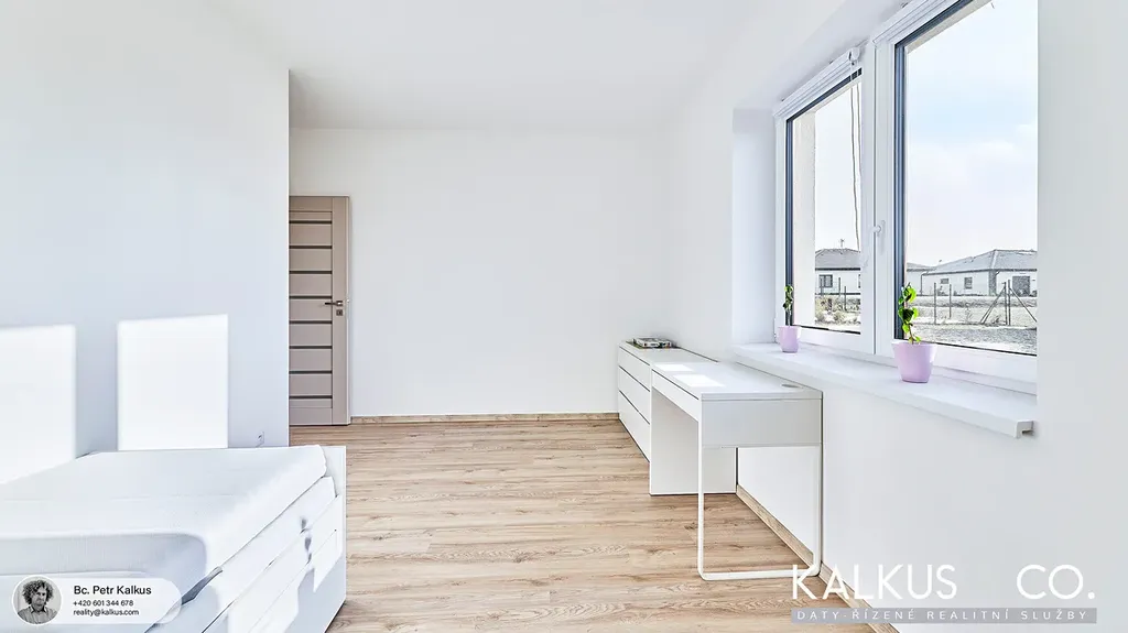 Součástí prodeje je veškeré vybavení dle fotografií – moderní kuchyňská linka od truhláře se spotřebiči a potravinovou skříní s výsuvy (výsuvný potravinový systém), pohovka s elektrickým výsuvem, TV, postele, skříně a další zařízení. Dům, spotřebiče i vybavení jsou stále v záruce.