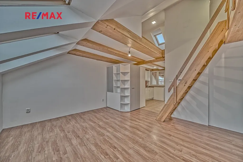 Byt se nachází ve 4. nadzemním podlaží cihlového domu bez výtahu. Dispozice je praktická a nabízí dostatek soukromí. Obývací pokoj je propojen dřevěným schodištěm s úložným/podkrovním prostorem nad bytem. Dále byt disponuje samostatným pokojem, kuchyní se vstupem na lodžii, koupelnou s rohovou vanou a samostatným WC.