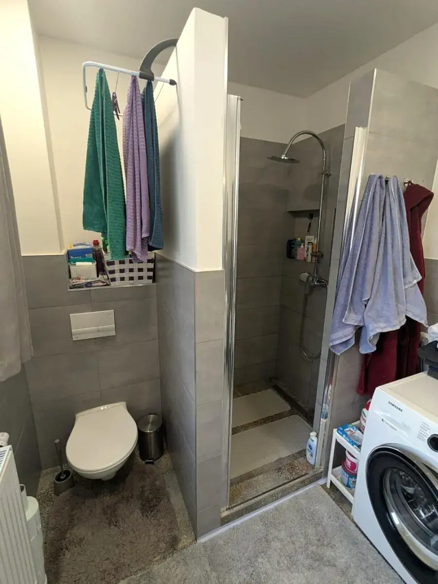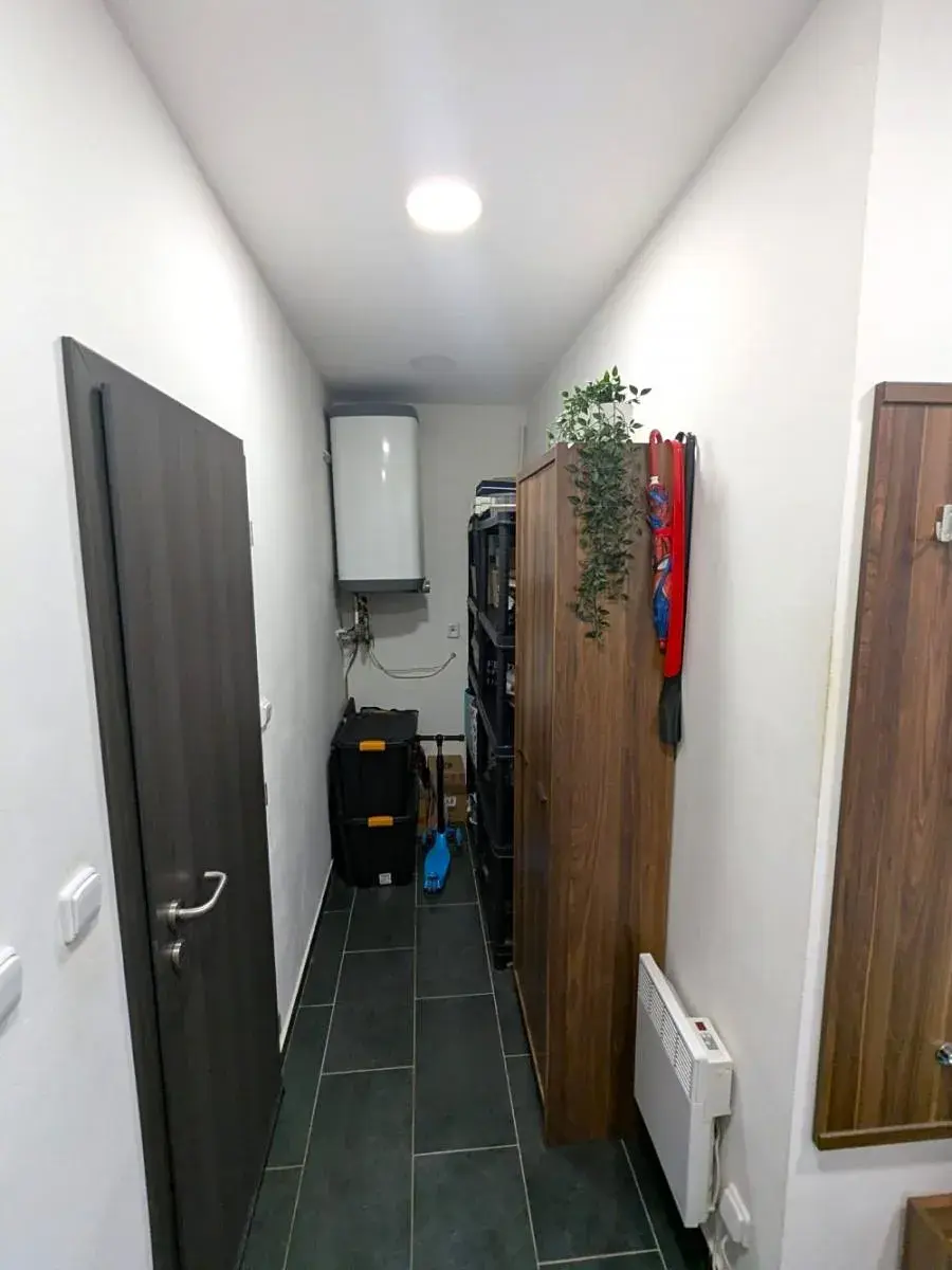 V kuchyni je linka s vestavěnými spotřebiči, prostorem pro lednici a přípojkou na myčku. Obývací část je velmi prostorná. Velkou výhodou jsou 2 toalety. Při vstupu do bytu je toaleta s umyvadlem a vedle v další místnosti je koupelna s WC, sprchovým koutem a 2 skříňky se 2 umyvadly. Z chodby je vstup do dalších 3 pokojů. Žádná z místností není průchozí, což je velká výhoda v rámci soukromí. Nově je v domě rozvedeno plynové topení.