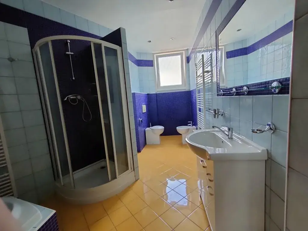 Koupelna je velmi nadstandardně vybavena - sprchový kout i vana, WC a bidet, samozřejmostí umyvadlo se zrcadlem. V kuchyni je designová modrá linka s vestavěnými spotřebiči včetně myčky či plynového kotle.