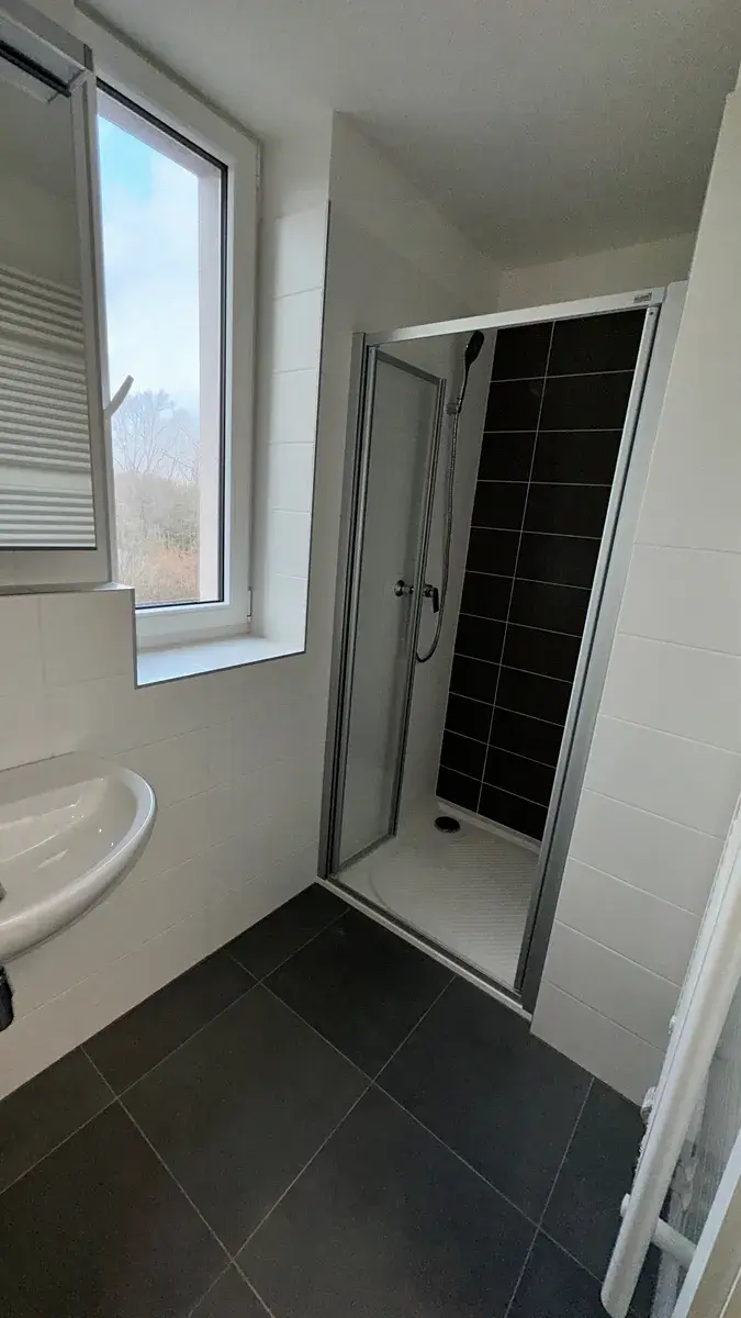 - V koupelně naleznete pohodlný sprchový kout, žebřík na sušení ručníků a přípravu pro instalaci pračky a sušičky.