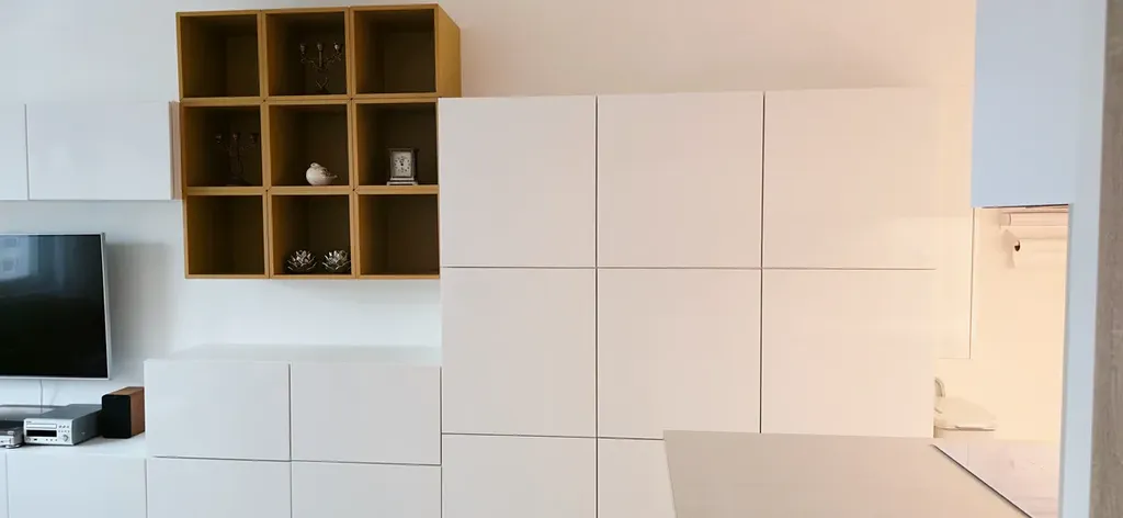 Nový majitel bytu zejména ocení moderní propojení obývacího pokoje s kuchyňským koutem, a to díky zvolenému nábytku, který odděluje obě obytné části od sebe, a přesto tvoří jednotu. Skvěle vypadající kuchyňský kout je vybaven kuchyňskou linkou od společnosti IKEA se zabudovanými el. spotřebiči zn. IKEA /indukční varná deska, elektrická trouba, myčka nádobí, digestoř a kombinovaná lednice s mrazákem/. Součástí kuchyňské linky je také sušička prádla zn. BOSCH.