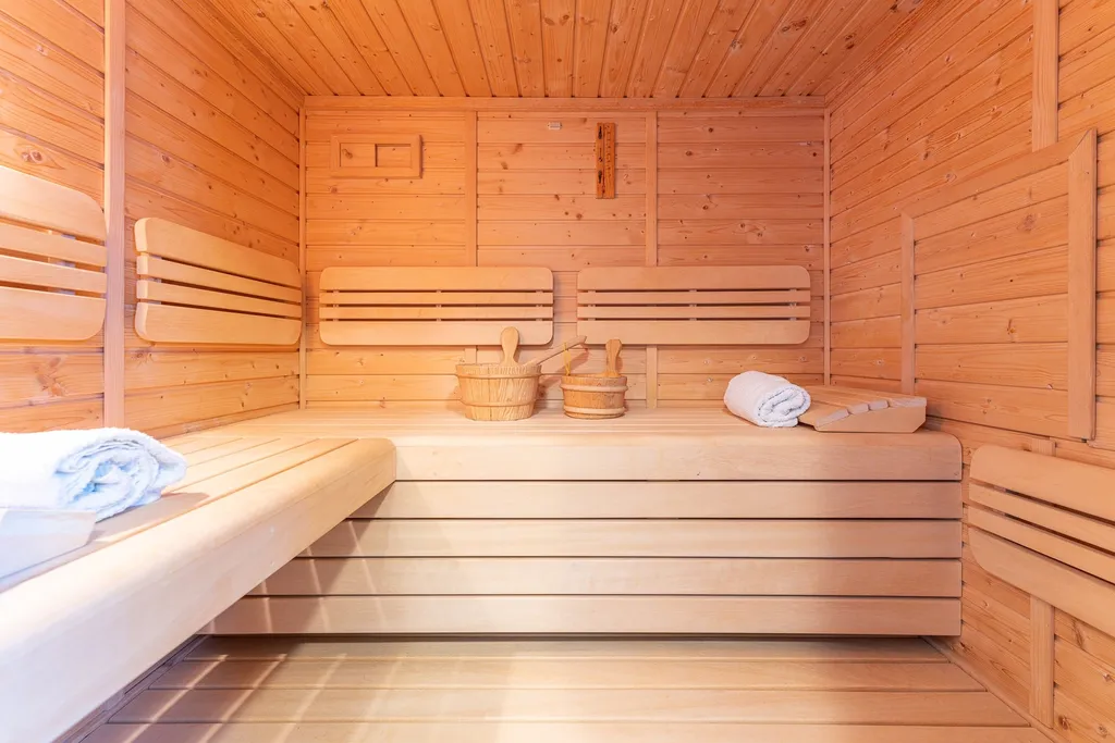 V koupelně se nachází praktická sauna, kterou lze vnímat jako doplňkový komfortní prvek.