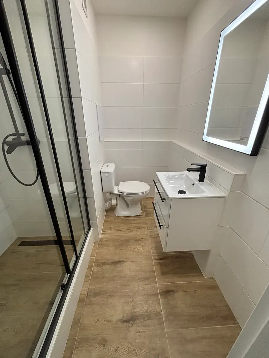 Jádro je zděné. Koupelna se sprchovým koutem je společná s toaletou. Vytápění i ohřev vody jsou dálkově.