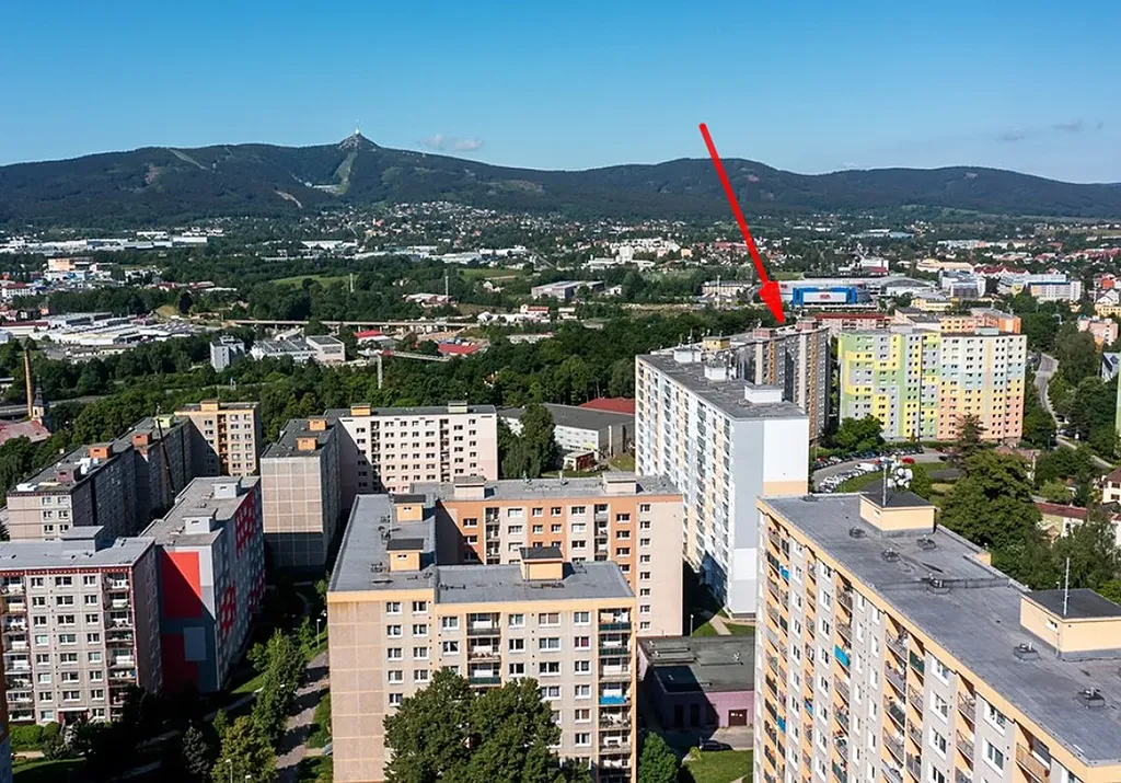 Byt se nachází v panelovém domě v 5. podlaží z 12. Oba pokoje s orientací na jihozápad, s výhledem na zelené panorama s Ještědem.