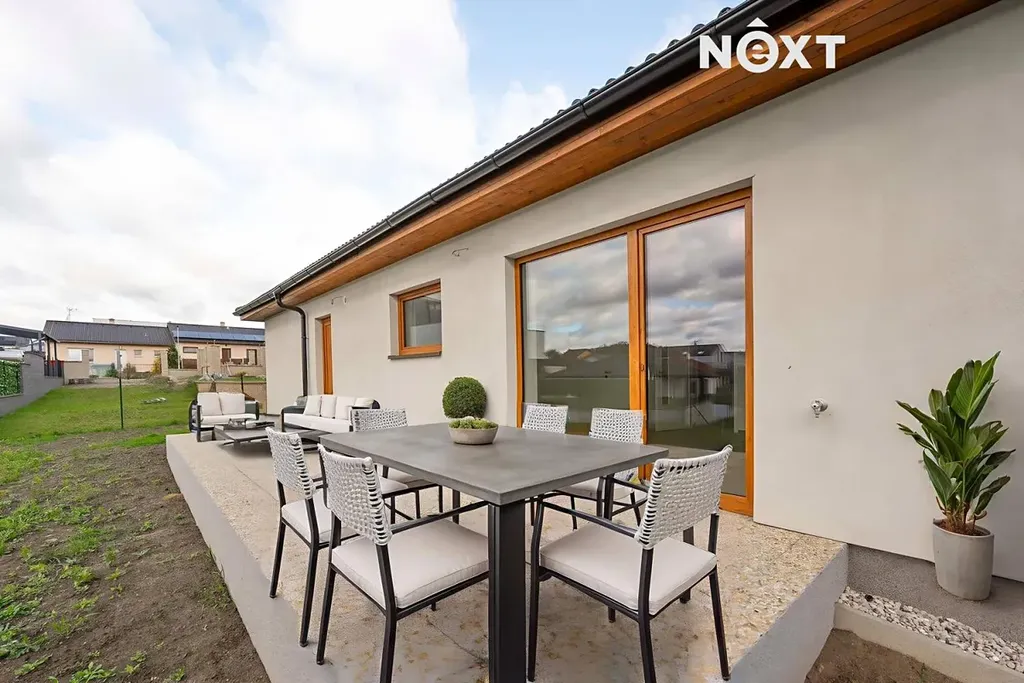 Z obývacího pokoje je přímý vstup na terasu o výměře 23 m², odkud se otevírá krásný výhled do okolní krajiny a na nedaleké dětské hřiště.