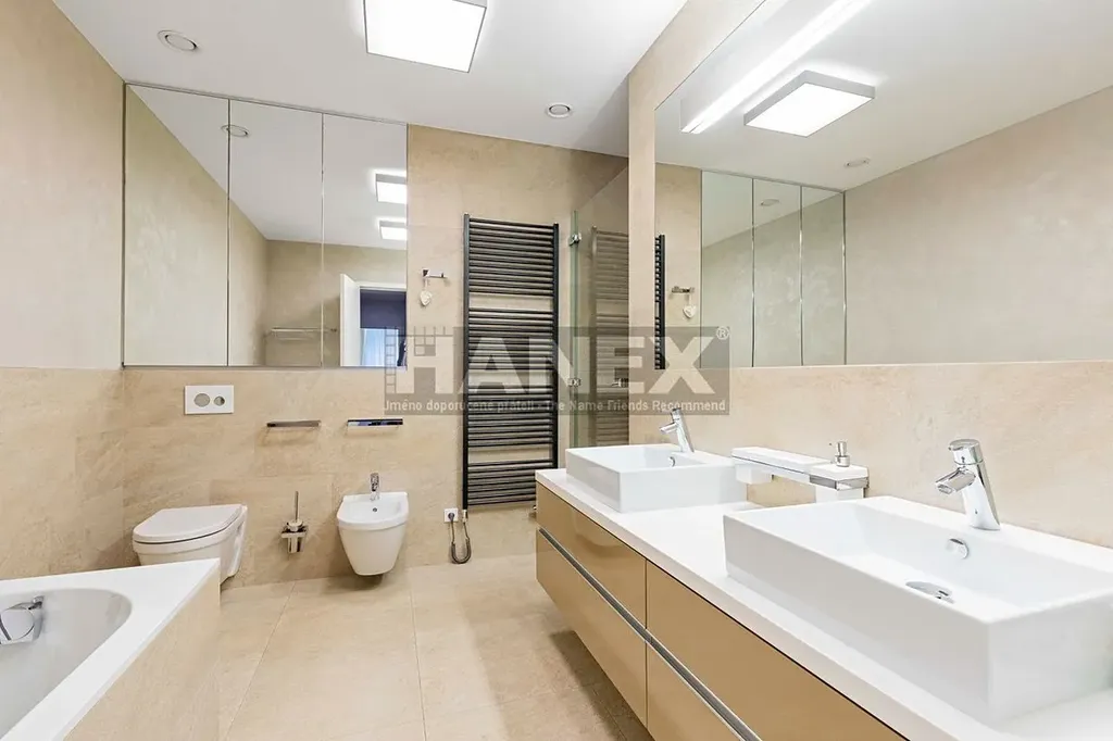 Moderní designový byt 3+kk (99 m2) s velkou privátní zahradou (200 m2), parkovacím stáním a sklepem v luxusní rezidenci v Praze 4 – Hodkovičkách. Nadstandardně vybavený a zařízený byt vás nadchne svou velkorysou dispozicí a vzdušností. Plně klimatizovaný byt nabízí 2 ložnice, prostornou šatnu – walk in closet, koupelnu s vanou, sprchový kout a toaletou a samostatnou toaletu. Z obývacího pokoje (40 m2) s kuchyňským koutem je přímý vstup do zahrady. Kuchyňská linka s ostrůvkem je vybavena kvalitními vestavěnými spotřebiči. Luxusní bydlení doplňuje krytá terasa s vířivkou. Předokenní žaluzie. Orientace bytu jih a východ.