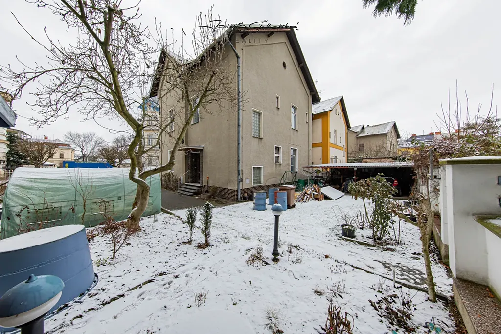 Velkým benefitem je možnost využívat posezení v altánu na zahradě — ideální místo na letní studium, ranní snídani nebo večerní relax pod stromy a kochat se krásnou udržovanou zahradou o kterou majitelé s láskou a invencí pečují. Teď v zimě to není moc vidět, ale od jara do podzimu jste v zeleném ráji. V zahradním přístřešku možnost uschování kol či koloběžek.