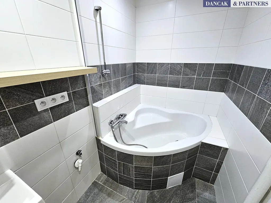 - koupelna s rohovou vanou, keramickými obklady, umyvadlem se skříňkou a prostorem pro pračku