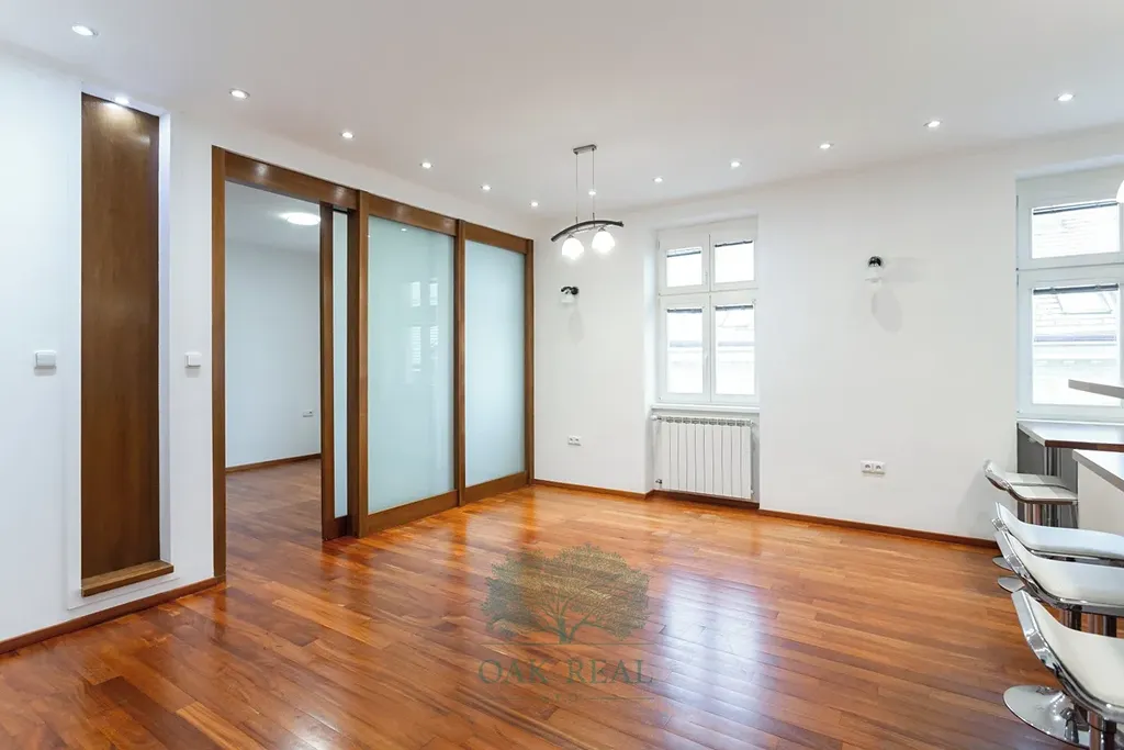 Dominantou bytu je prostorný obývací pokoj propojený s kuchyňským koutem se zabudovanými spotřebiči. Kuchyňský ostrůvek tvoří vestavěná myčka, dřez a barový pult, na druhé straně je vestavěný jídelní stůl. Prosklená stěna s posuvnými dveřmi z mléčného skla odděluje ložnici od obývacího pokoje, zachovává pocit vzdušnosti a světlosti. Ložnice má vestavěnou šatní skříň a vlastní koupelnu vybavenou vanou, prostorným sprchovým koutem, toaletou a pisoárem. Druhý samostatný pokoj má výhled do klidného vnitrobloku a je propojený chodbou s přístupem do menší koupelny pro hosty či pokoj. Koupelna obsahuje velký sprchový kout, umyvadlo a toaletu. Technická místnost poskytuje prostor pro boiler, plynový kotel, pračku, sušičku a další zázemí bytu. Podlahy jsou z exotického afrického dřeva Doussié, okna jsou dřevěná vybavena žaluziemi. Díky své poloze je byt světlý a bez přímého kontaktu s okny sousedů.