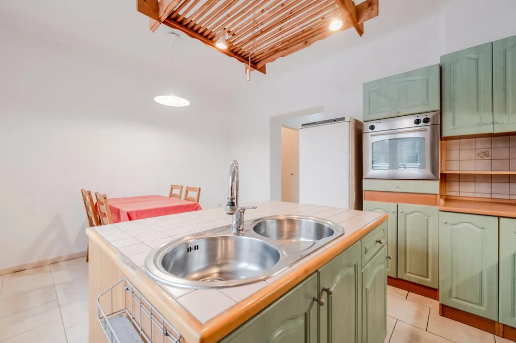 Byt, který vám představujeme, má velice praktické rozmístění jednotlivých místností a bude se vám líbit. Umístění bytu ve zvýšeném přízemí zajišťuje výhledy do zeleně v zahradě. Na celkové ploše 68 m2 naleznete 3 pokoje. Dvě ložnice: každá zařízená dvěma postelemi, křeslem, stolkem a skříní. Třetím pokojem je pracovna s vestavěným patrem na spaní a pracovním koutem. Přes chodbu vejdete do prostorné kuchyně s jídelnou. Samostatné vstupy z chodby má i samostatná toaleta a koupelna (s vanou, umyvadlem a přípojkou na pračku). Kuchyňská linka s ostrůvkem disponuje mnoha úložnými možnostmi, velkou pracovní plochou a spotřebiči (lednicí, mrazákem, troubou a varnou deskou) a je doplněna jídelním stolem a židlemi.