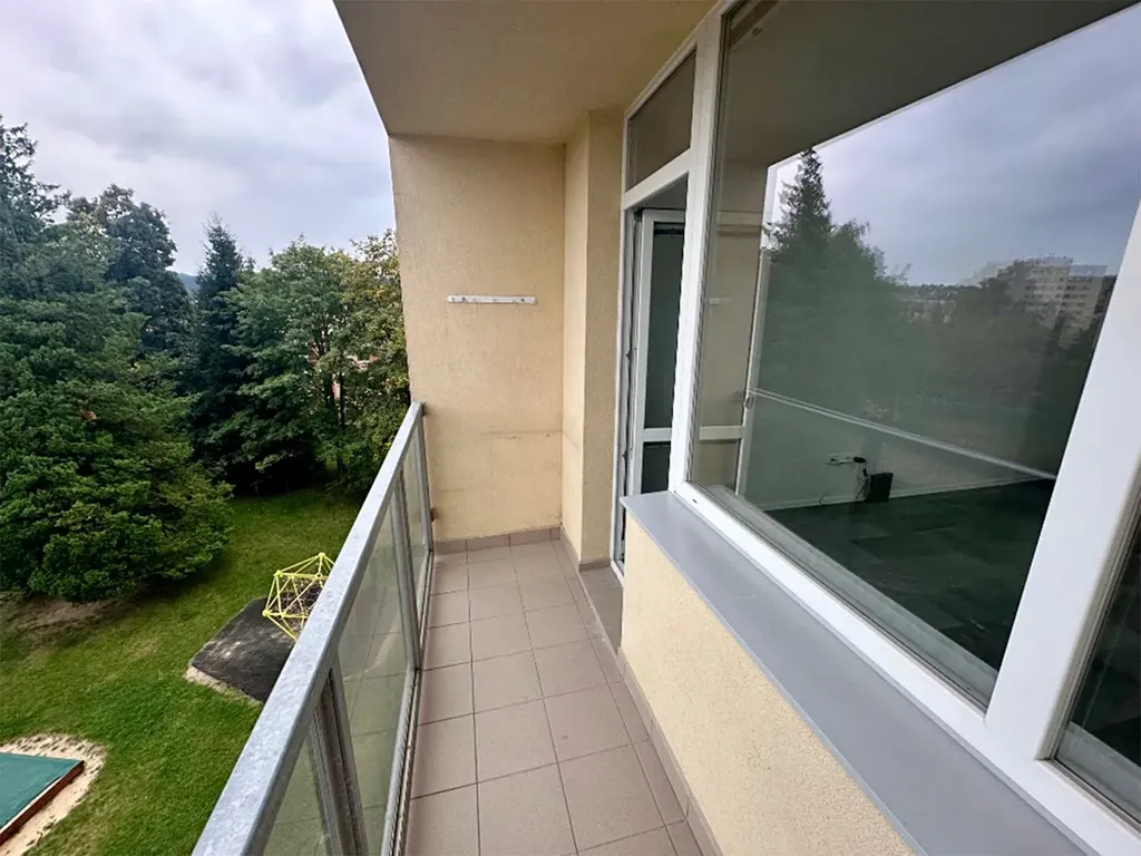 Byt je umístěn ve 4. patře klidného panelového domu a jeho výměra činí 28 m². K bytu náleží lodžie a sklep. Dispozičně je řešen jako jeden obytný pokoj, který slouží jako obývací část se spaním, a je zde umístěna menší kuchyňská linka. Součástí vybavení je pračka, sklokeramická varná deska s digestoří, mikrovlnná trouba a koupelna se sprchovým koutem a toaletou. V nájemném je zahrnuto také internetové připojení.