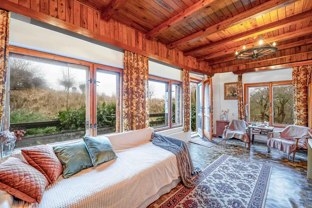 Dominantou celé chaty je velký obývací pokoj o velikosti 24 m² s krbem. Otevřený a vzdušný prostor s velkými prosklenými okny plynule navazuje na balkon s výhledem do zeleně. Tohle místo bude přesně pro vás. Ráno si v tichu vychutnáte kávu a snídani na balkoně a budete sledovat, jak se krajina pomalu probouzí s východem slunce. A večer? Ten patří tichu, výhledu do krajiny a praskání dřeva v krbu, které dává tomuto místu jeho skutečnou atmosféru.