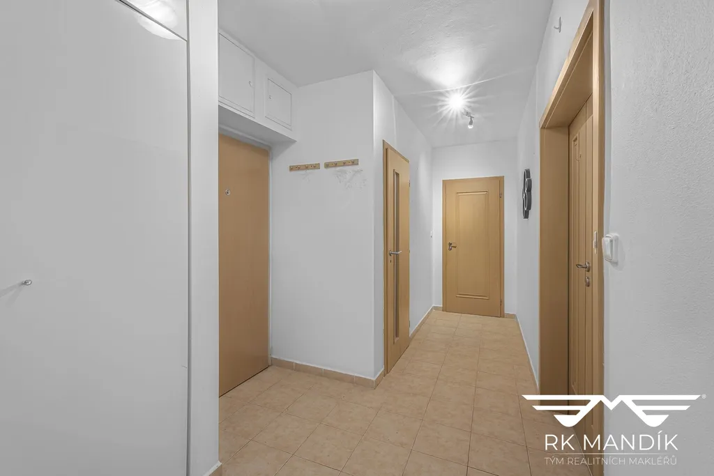 Vstupní chodba disponuje praktickou vestavěnou skříní poskytující dostatek úložného prostoru. Koupelna je vybavena sprchovým koutem, umyvadlem se zrcadlem, topným žebříkem a pračkou značky Samsung. Toaleta je řešena samostatně. Vytápění bytu a ohřev teplé vody zajišťuje vlastní plynový kotel.