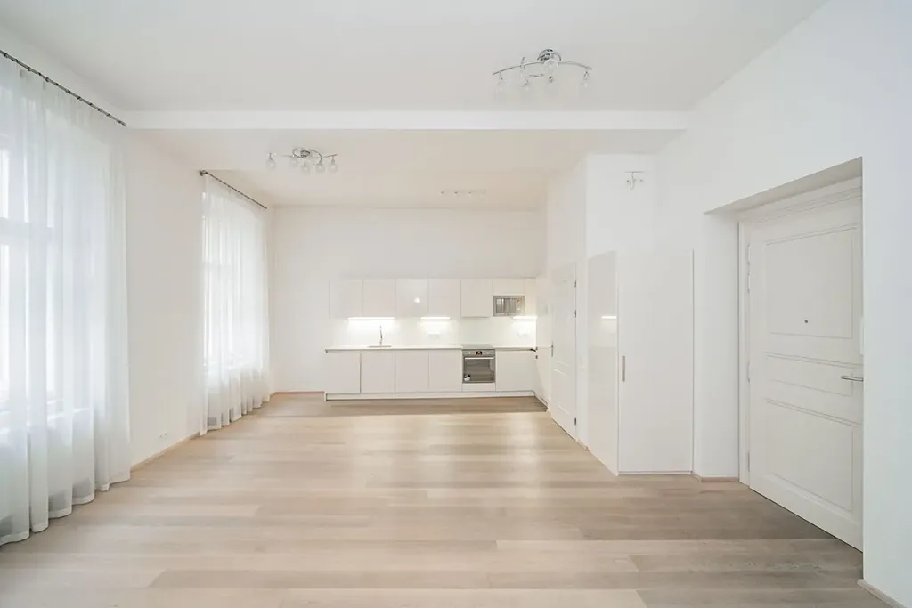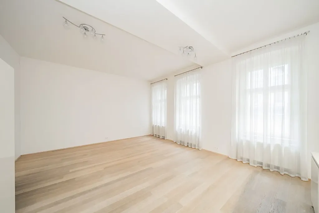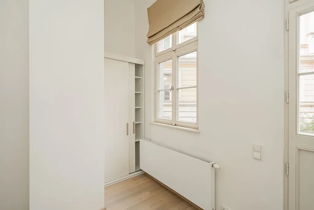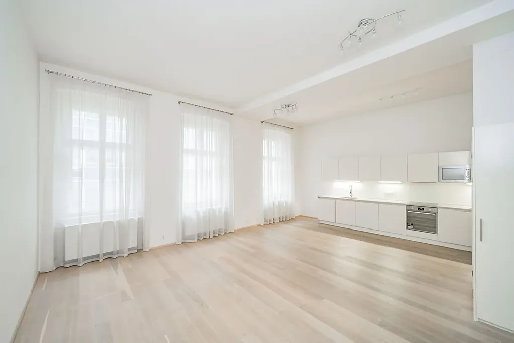 Reprezentativní, světlý byt 2+kk (1 ložnice, 1 koupelna), o rozloze 67m2 s terasou, je situovaný v 1. patře renovované rezidenční budovy s výtahem, na Novém Městě Praha 1, v Petrské ulici.