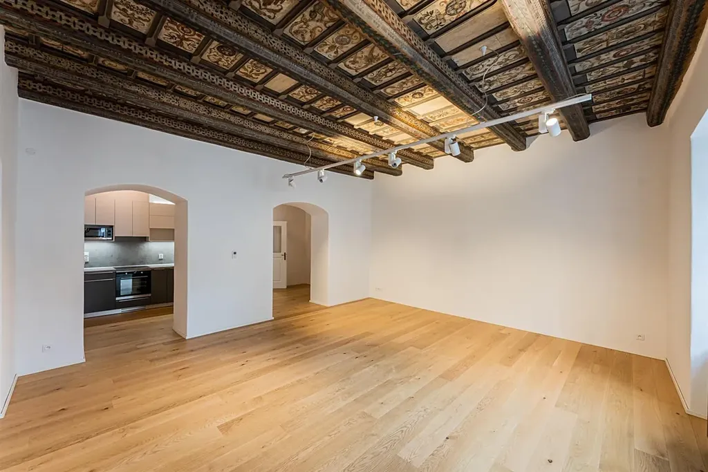 Interiér bytu je nezařízený. Byt dispozičně nabízí předsíň (8,23 m2), prostorný obývací pokoj (36,17 m2) s krásným malovaným historickým dřevěným stropem, propojený s moderní kuchyní (18,7 m2) s vestavěnými spotřebiči (lednice, mrazák, myčka, trouba, elektrická varná deska, mikrovlnná trouba) a s komorou (kde je přípojka na pračku), dále samostatnou ložnici (19,58 m2) se vstupem do vlastní designové koupelny (5,34 m2) s prostornou sprchou, toaletou, bidetem, dvěma umyvadly a podlahovým topením. Byt disponuje další samostatnou toaletou se vstupem z předsíně. Topení je plynové centrální.