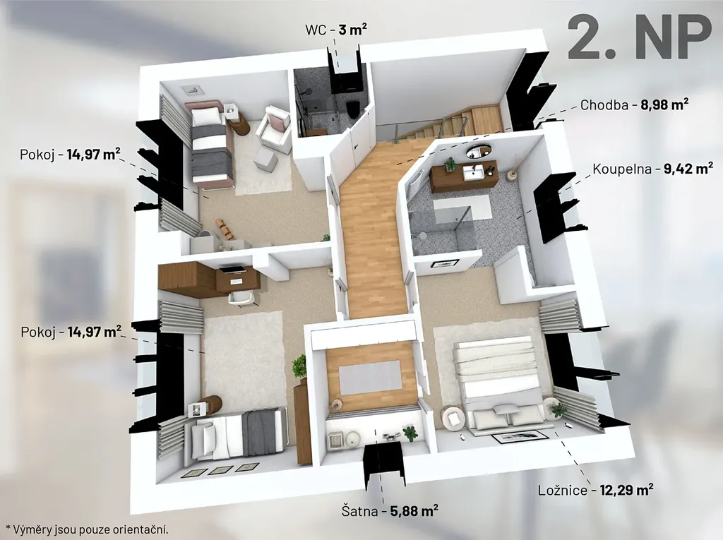 V patře na vás pak čekají 3 ložnice, 2 koupelny a praktická šatna do které se dostanete přímo z ložnice.