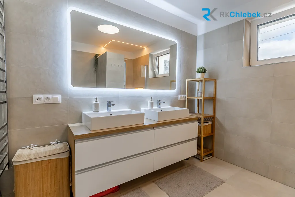 Kvalitně postavená cihlová stavba splňuje energetickou náročnost kategorie A (PENB). Fotovoltaické panely 10kWp a bateriové úložiště 15kW nabízejí možnost poslat přebytky do sítě nebo si nabíjet elektro auta přímo doma. Před okenní rolety, posuvné terasové dveře na zahradu a výběr kvalitních materiálů se smyslem pro detail je zaslouženým luxusem.