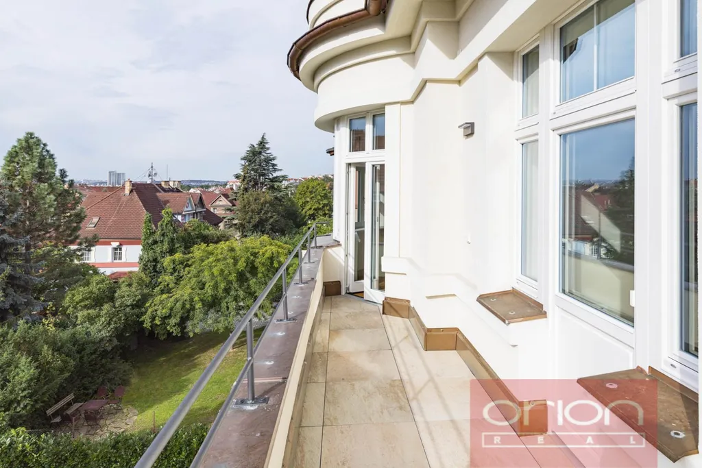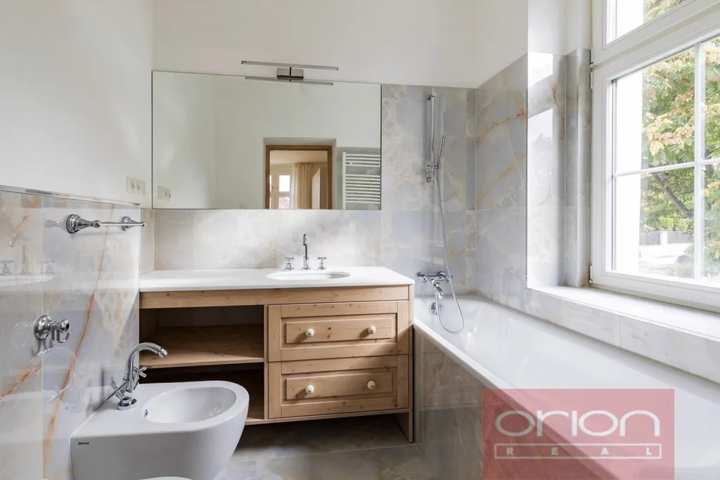 Nabízíme k pronájmu kompletně zrekonstruovaný, klimatizovaný byt v 1. patře rodinné vily se zahradou ve vyhledávané lokalitě Praha 10 - Vinohrady. Luxusní zařízený byt 4+1 má plochu 120 m2 a nabízí vstupní halu, plně vybavenou moderní kuchyň s jídelním koutem, prostorný a světlý obývací pokoj s velkými okny, s arkýřem a se vstupem na jižně orientovanou terasu o velikosti 10 m2, 3 ložnice, 3 koupelny (vana, sprchový kout, bidet, umyvadlo)), komoru. K vybavení bytu patří dřevěné parkety a mramorová dlažba s podlahovým vytápěním, pračka se sušičkou, klimatizace, alarm a samostatný plynový kotel. Dům se nachází v klidné vilové čtvrti, pouze pár kroků od tramvajové zastávky, 15 minut chůze ke stanici metra a nákupnímu centru Flora. Lokalita s velice dobrou dopravní dostupností MHD i autem, s veškerou občanskou vybaveností. V blízkém okolí množství obhodů, restaurací, bister, kaváren, nedaleko parků a městské zeleně.