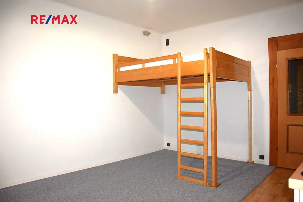 Jedná se o byt s menší předsíní, kde je však chytře vyřešen úložný prostor, z předsíně vstoupíme jak do koupelny se sprchovým koutem a WC tak do hlavního, obývacího pokoje o výměře cca 19 m2, kde je umístěna kuchyňská linka s lednicí, sporákem a mikrovlnou troubou. A dále pak dřevěné patro na spaní a skříň.