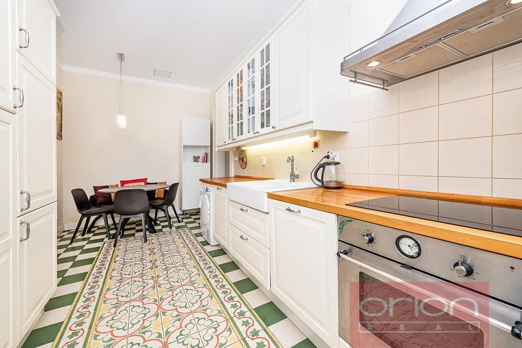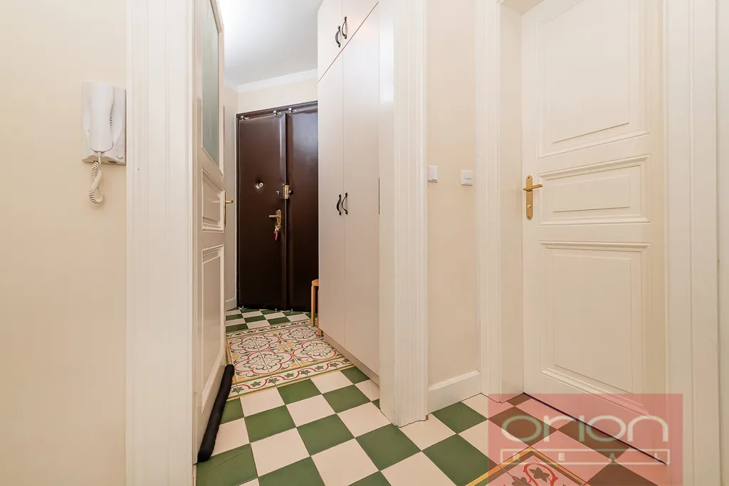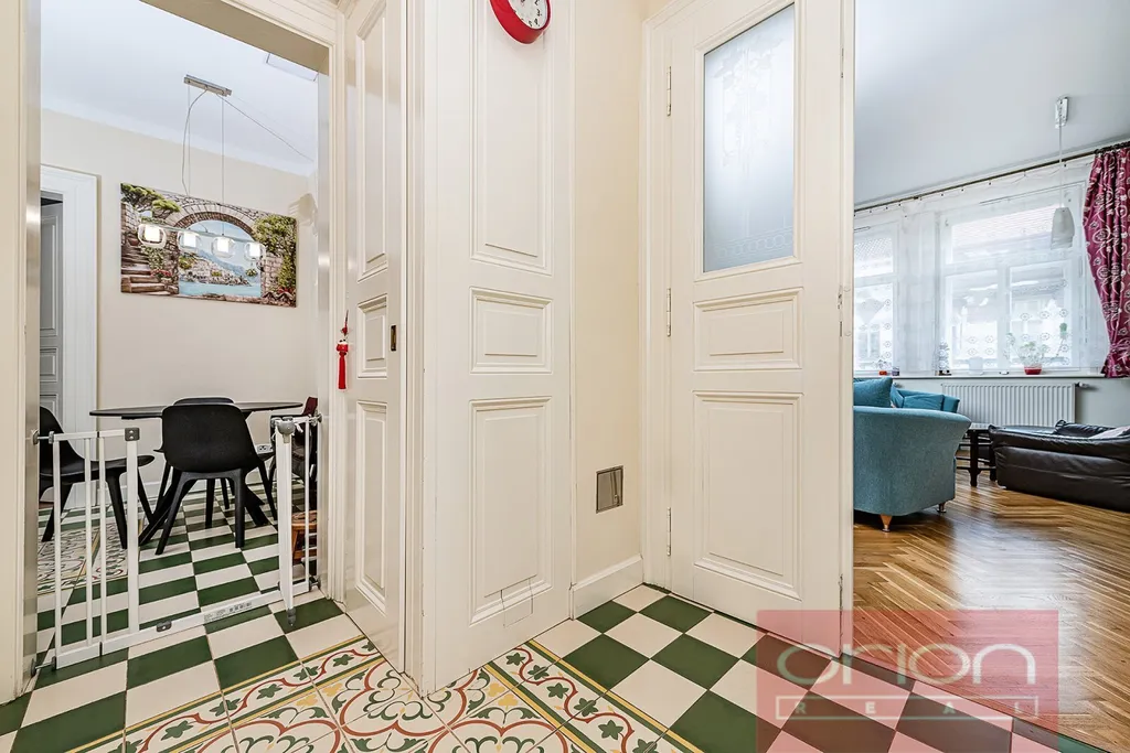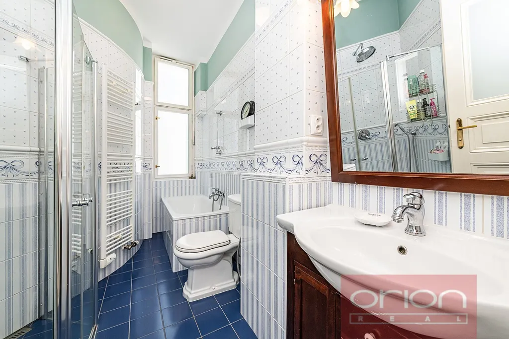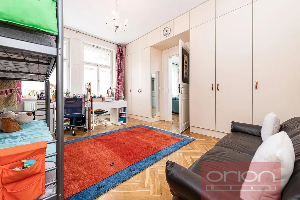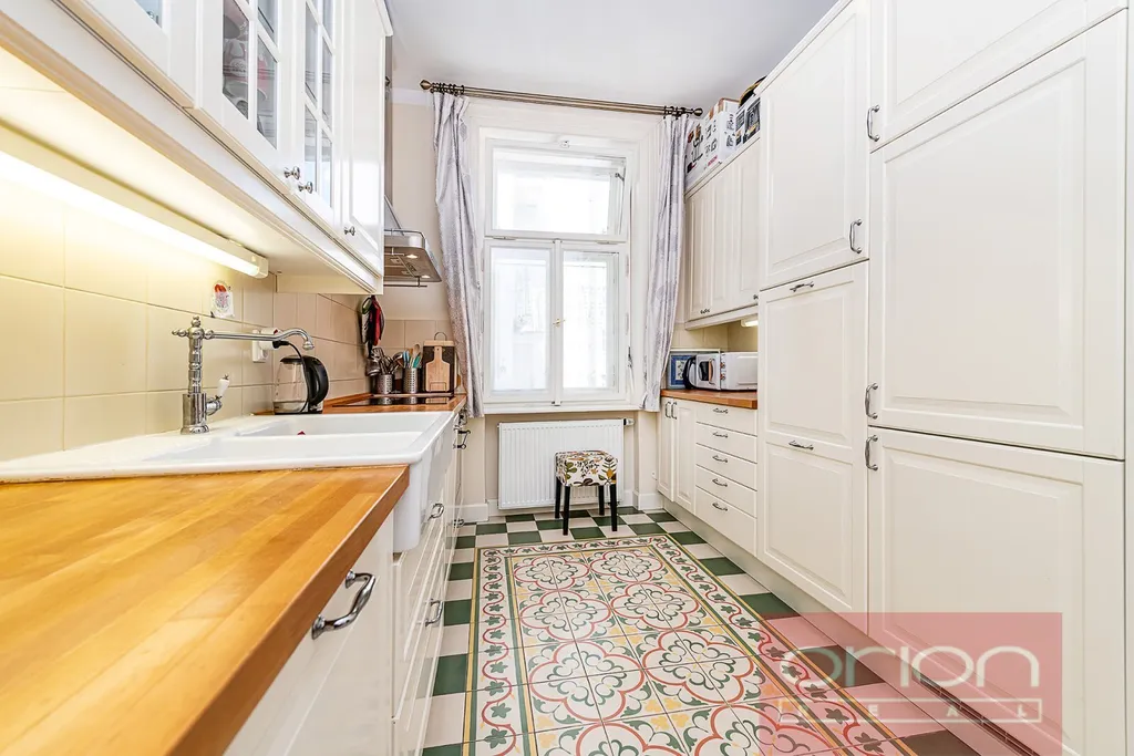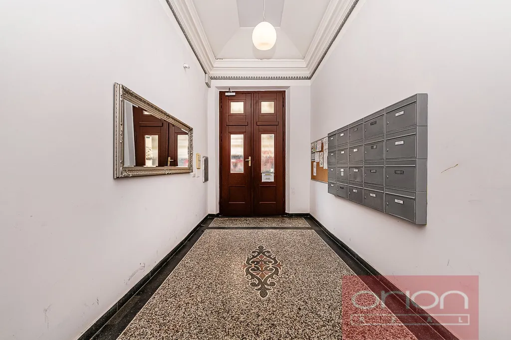Dispozice bytu nabízí předsíň, halu, samostatnou kuchyň s jídelním koutem, obývací pokoj, dvě ložnice, koupelnu s vanou, sprchovým koutem a toaletou, a dále samostatnou toaletu s umývadlem. Jedna ložnice a kuchyň jsou orientované do vnitrobloku. Součástí prodeje je kuchyňská linka (IKEA) se spotřebiči (varná deska, trouba, lednice s mrazákem, myčka nádobí, pračka, sušička), vestavěné skříně v pokojích a v předsíni. Interiér bytu je laděn do přírodních materiálů - repasovaná špaletová okna, renovované dřevěné dveře s pískovanými skly, renovované parkety a vysoké stropy dodávají bytu příjemnou a útulnou atmosféru. V koupelně je podlahové topení, vytápění je plynovým kotlem Vaillant.