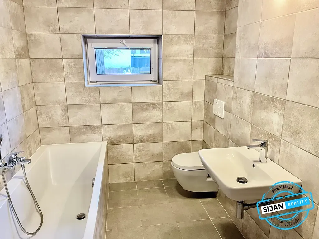 Moderní koupelna byla navržena s důrazem na funkčnost a čistý design – k dispozici je vana, umyvadlo a toaleta.