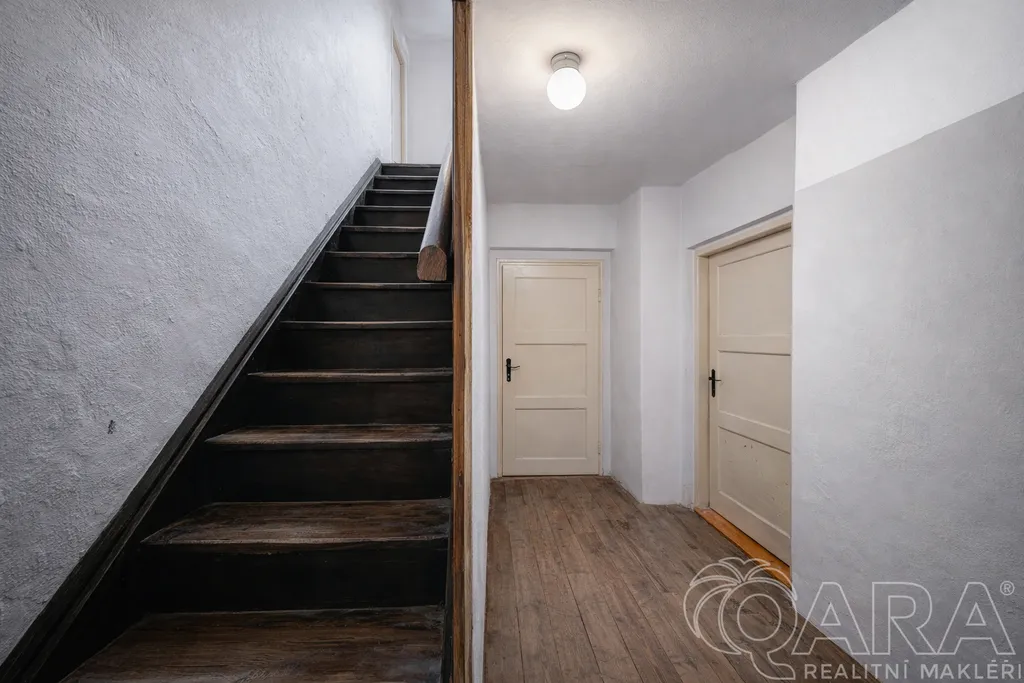 V patře (2. NP) o výměře 25,5 m² se nachází další 1 pokoj a praktický úložný prostor. Ohřev vody zajišťuje bojler (elektro), jehož instalace proběhla v roce 2025. Odpad je řešen jímkou o kapacitě 8 kubíků. K nemovitosti náleží také velká zahrada a praktická kůlna.
