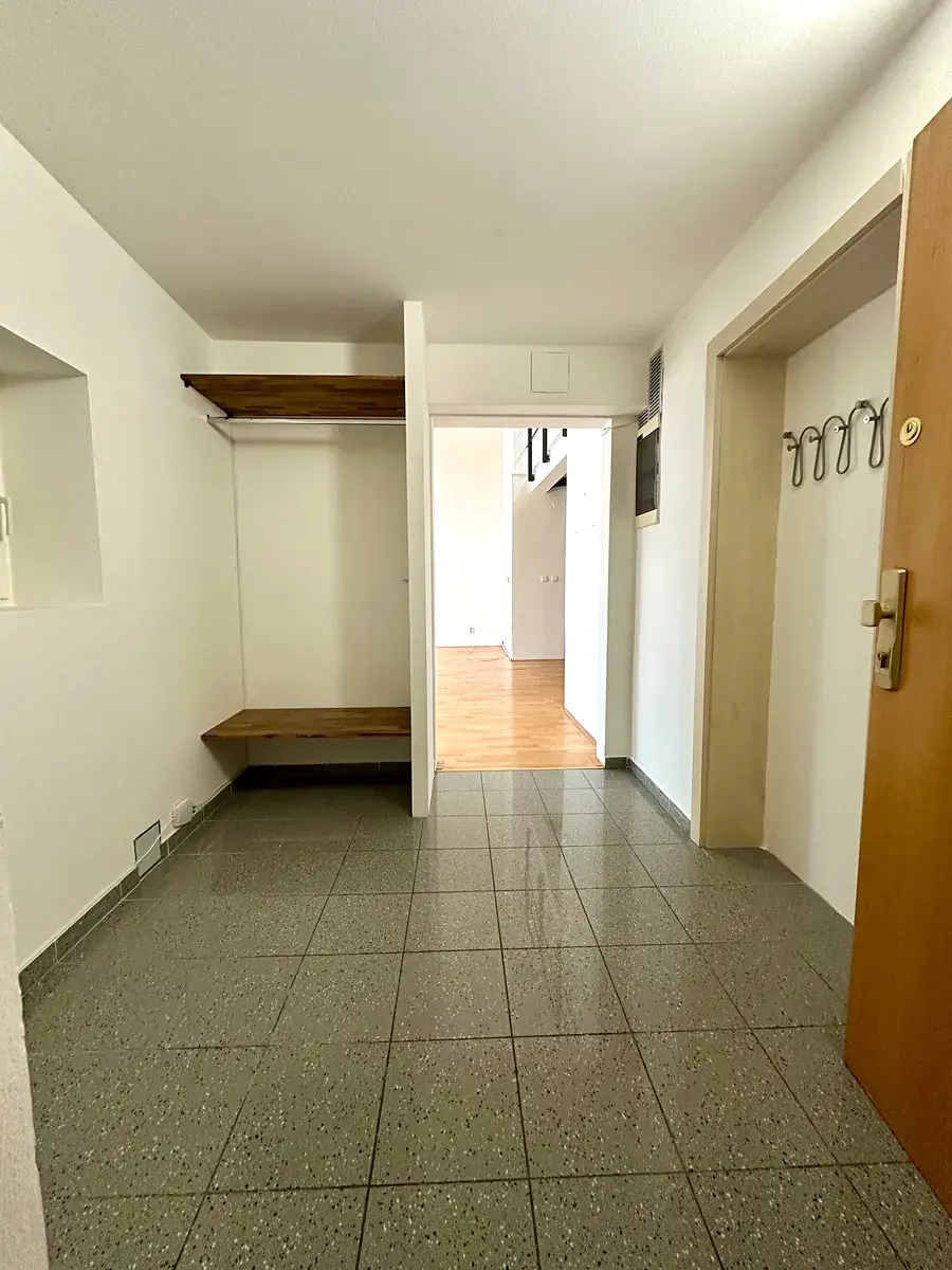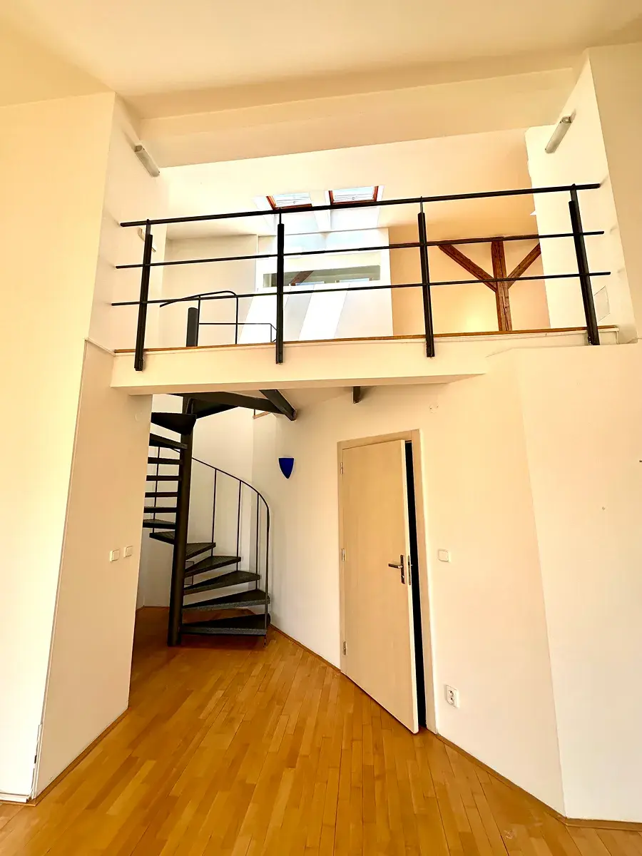 Přes předsíň se vstupuje do světlého obývacího prostoru s kuchyňským koutem. Jemné moderní rysy doplňují původní dřevěné trámy. Celou atmosféru dotváří ocelové schodiště. V bytě jsou dvě koupelny i terasa k příjemnému posezení a mnoho dalším milých detailů, které Vás nepřestanou uchvacovat.