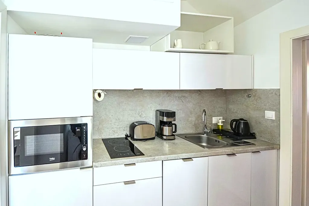 Kuchyňský kout je vybaven moderní kuchyňskou linkou s vestavěnými a drobnými spotřebiči (elektrická trouba, dvouplotýnková varná deska, mikrovlnná trouba, myčka, lednice s mrazničkou, kávovar, rychlovarná konvice, toustovač). V esteticky navržené koupelně se nachází sprchový kout, umyvadlo, zrcadlová skříňka, otopný žebřík, vysoušeč vlasů. V technické místnosti je instalována pračka. Zimní zahrada nabízí příjemné posezení za každého počasí a v jakékoli roční době.