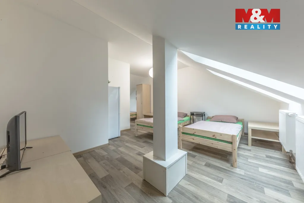 Samostatně stojící dům o užitné ploše 285 m² se sklepem o výměře 35 m² je dlouhodobě provozován jako pokojový dům s vyváženou kombinací dlouhodobých a krátkodobých pronájmů (50/50). Dispozičně je rozdělen na 9 ložnic, 4 kuchyně a 4 koupelny s WC, což zajišťuje vysokou obsazenost a stabilní výnos.