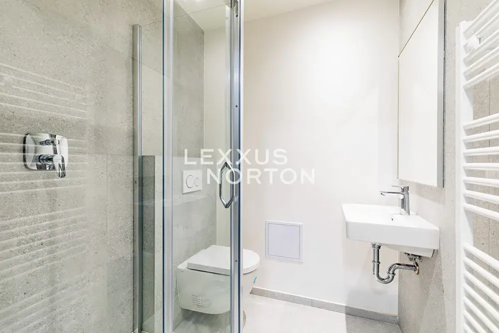 Plně vybavený kuchyňský kout je osazen sklokeramickou varnou deskou, troubou, lednicí s mrazákem, mikrovlnnou troubou a myčkou nádobí. Byt disponuje dvěma koupelnami – jedna je vybavena vanou a toaletou, druhá sprchovým koutem a toaletou. Ve větší ložnici se nachází designová vestavěná, velkoryse řešená skříň poskytující dostatek úložného prostoru nejen na šatstvo.