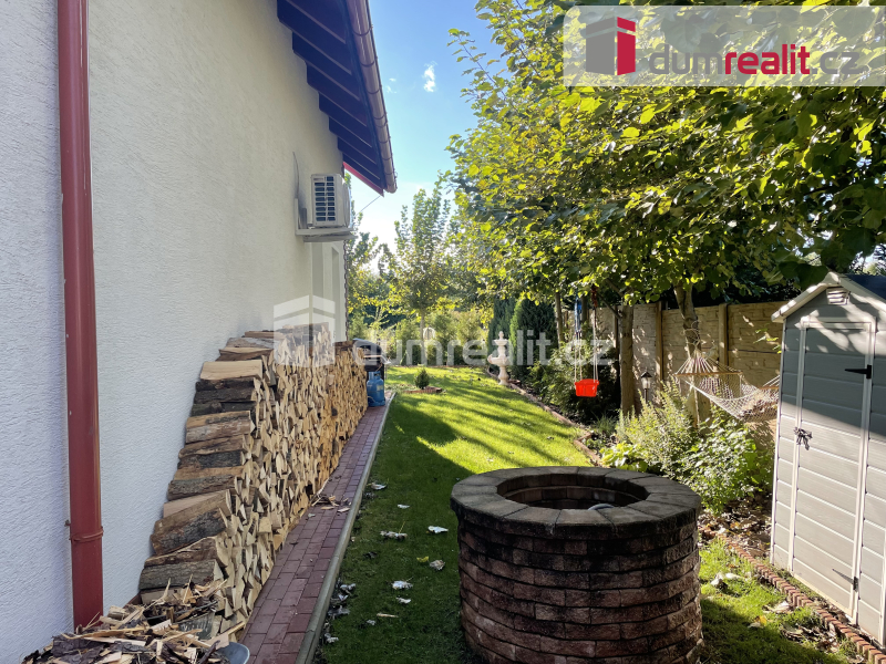 Kolem domu prostorná udržovaná zahrada se zavlažovacím systémem, využívající dešťovou vodu. Součástí prodeje je garáž na dvě osobní vozidla navazující na obytnou část domu s venkovním zastřešeným parkovacím stáním na více osobních vozidel. Celý pozemek oplocen, vstup z obecní komunikace bránou s elektrickým pohonem.