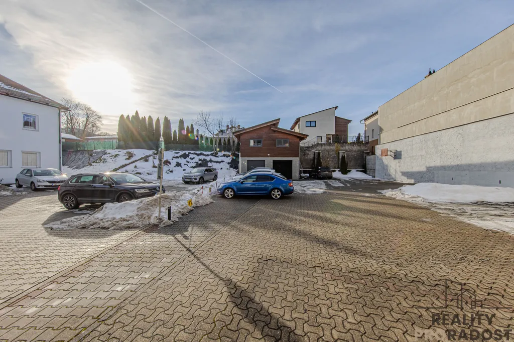 Velkým bonusem je rozsáhlé parkování na vlastním pozemku za domem. K dispozici je parkoviště se závorou, kde jsou pronajata parkovací stání, dále dvojgaráž a zahradní domek umístěný nad garáží, přičemž zastavěná plocha garáže činí 43 m². Celý pozemek je vydlážděn zámkovou dlažbou a jeho celková výměra činí 798 m².