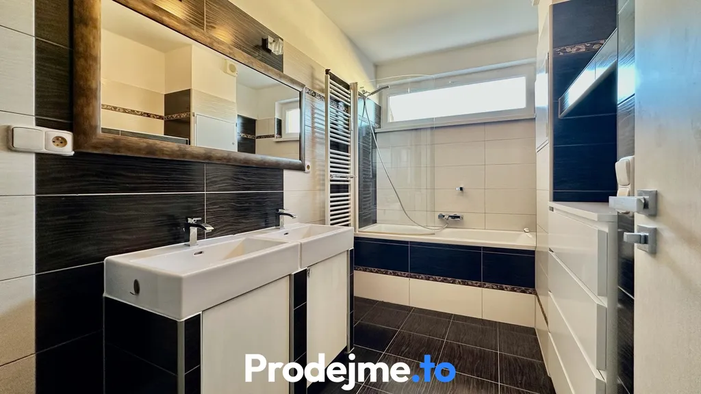 Koupelna je vybavena vanou, dvěma umyvadly a topným žebříkem. Velkým benefitem je okno, které zajišťuje denní světlo i přirozené větrání.