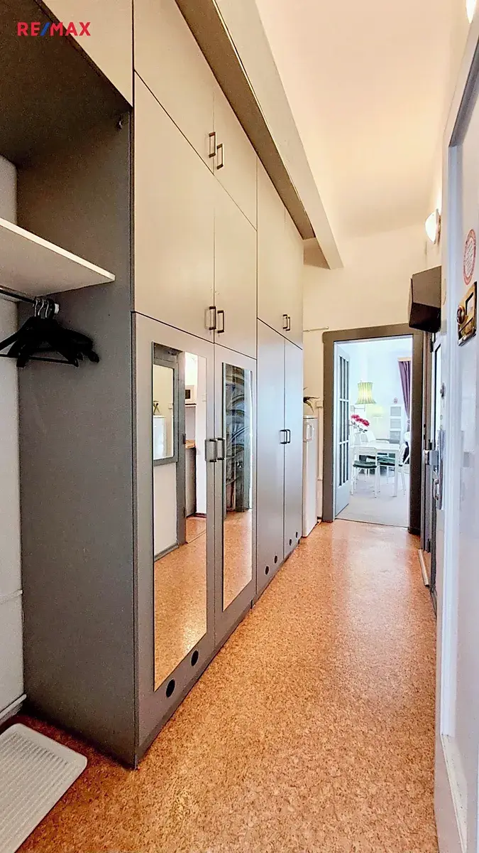 Ve vstupní chodbě bytu se nachází vestavěná skříň s dostatkem úložných prostor. Menší kuchyňka disponuje plynovým sporákem s troubou, mikrovlnnou troubou, k dispozici je také lednice.