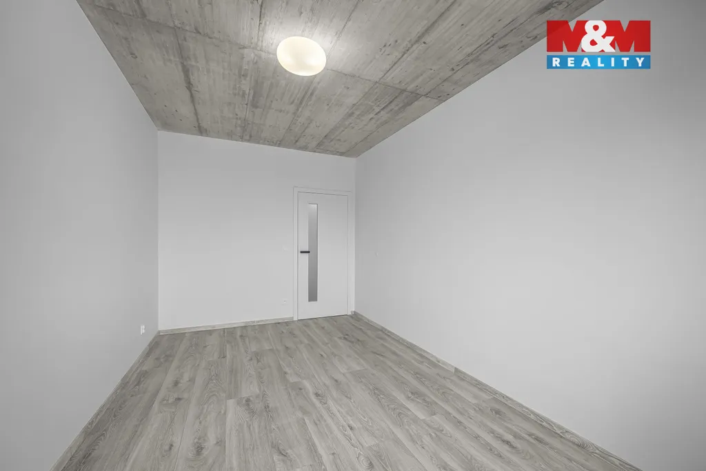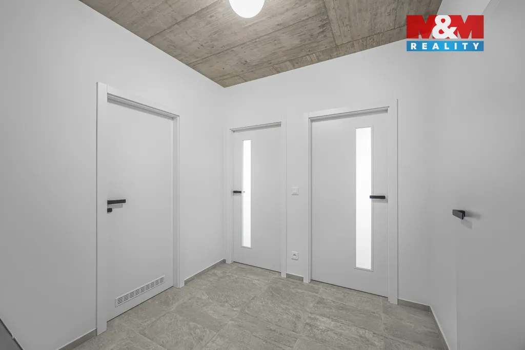 Interiér zaujme na první pohled: pohledové betonové stropy dodávají prostoru industriální eleganci, kvalitní voděvzdorné podlahy a designové dveře s precizním kováním podtrhují nadstandardní provedení. Součástí je walk-in skleněný sprchový kout s podomítkovou baterií a venkovní, elektricky ovládané rolety.