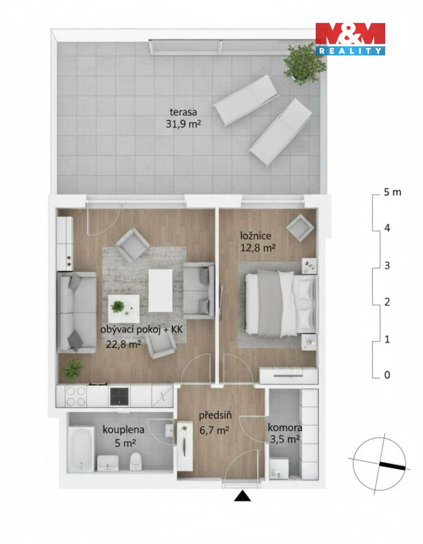 Zcela nový byt 2+kk, 53,2 m² s terasou 32 m² a sklepem – bydlení bez kompromisů.