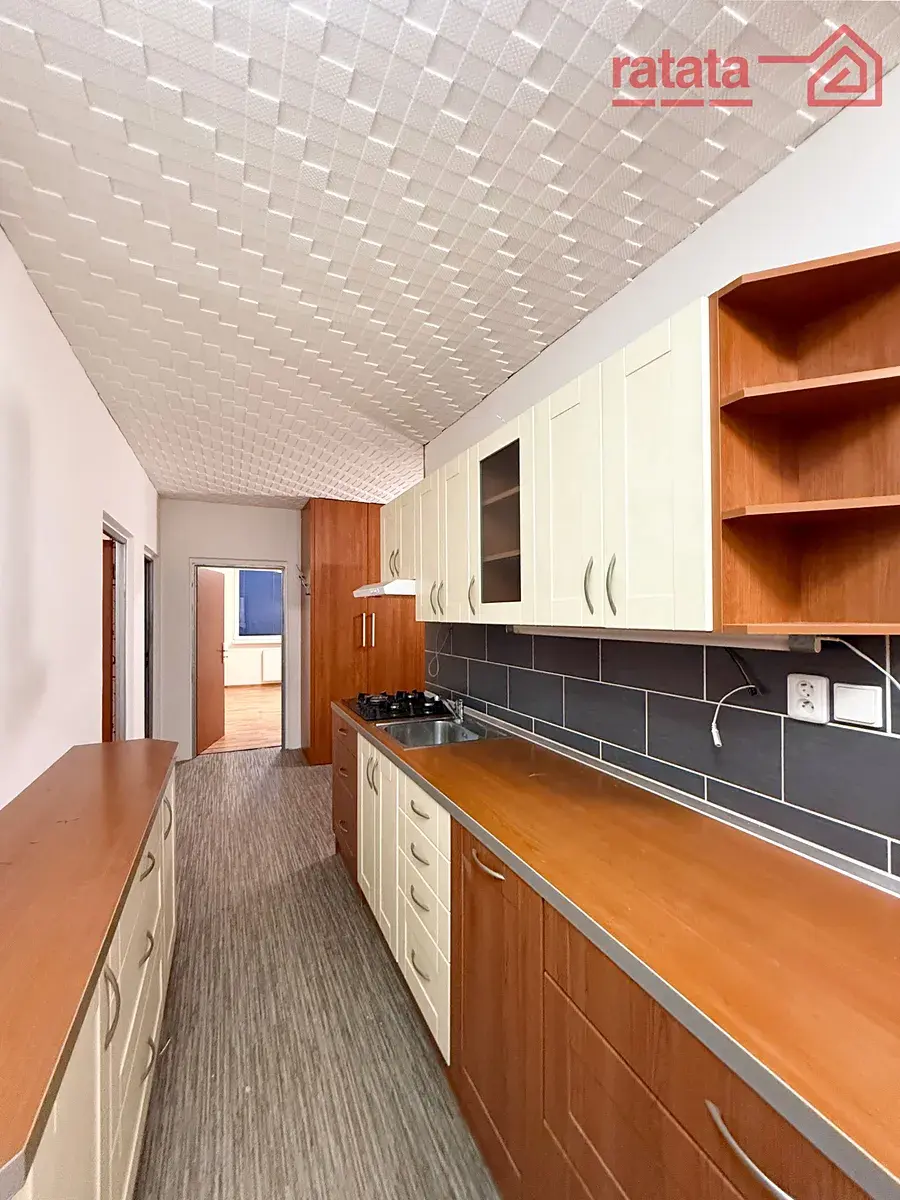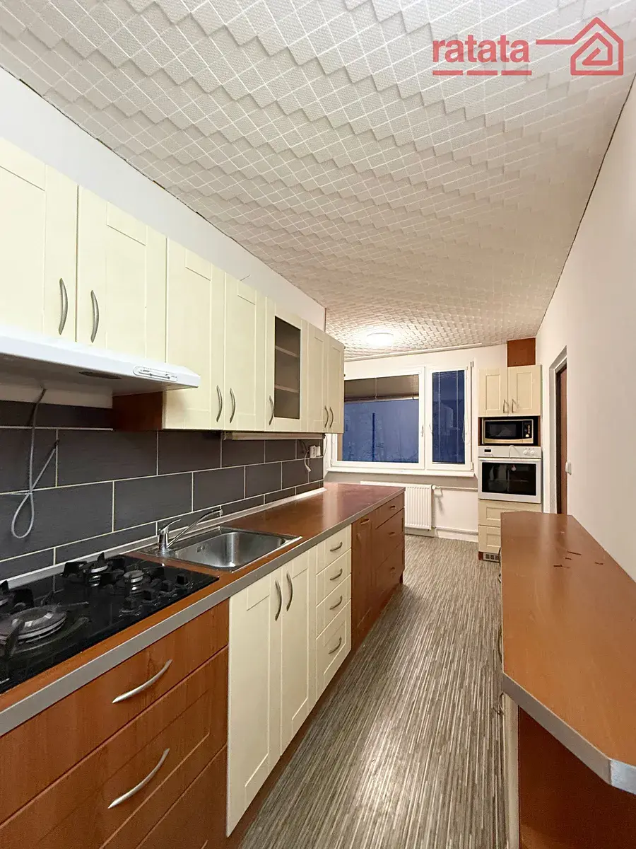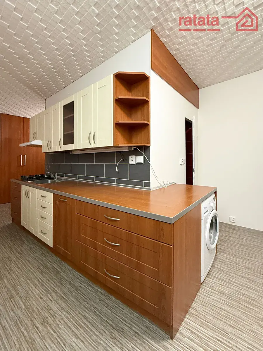Je to čistý a slunný byt. Je zde kuchyňská linka, plynová varná deska, vestavěná trouba, rohová vana, umyvadlo a WC. Na podlahách je položeno lino a dlažba. Byt je volný k nastěhování IHNED.